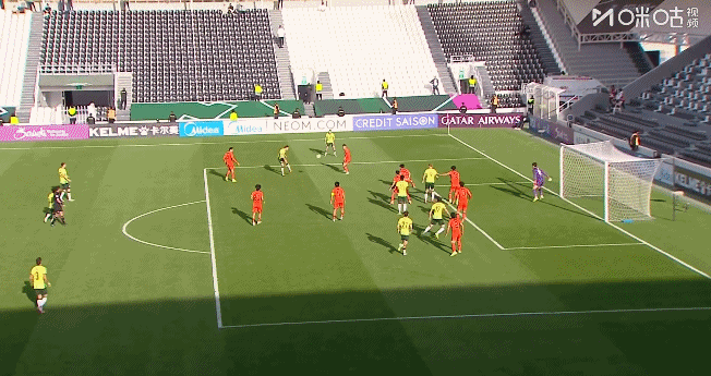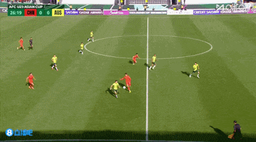 澳大利亚队逼抢凶狠,U23国足一时难以组织起有效的攻势,对球员的出球速度与准度提出了更高要求。第24分钟,王钰栋主罚前场任意球,随后队友左路传中造成禁区内混乱,门前的吾米提江被两人夹击,未能形成打门。
