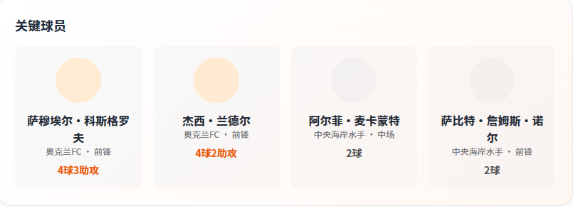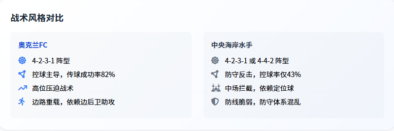 中央海岸水手客场预计摆出保守阵型,大概率沿用4-4-2立足防守反击,战术上依赖边路传中与定位球寻找机会,但受限于中场核心缺阵,进攻组织混乱,反击效率极低。球队进攻过度依赖少数球员的个人能力,场均关键传球数位列联赛倒数,面对奥克兰的高压逼抢,后场出球失误率极高,70分钟后体能下滑易出现防线漏洞,大概率全程被动防守,难以组织起有效反击。