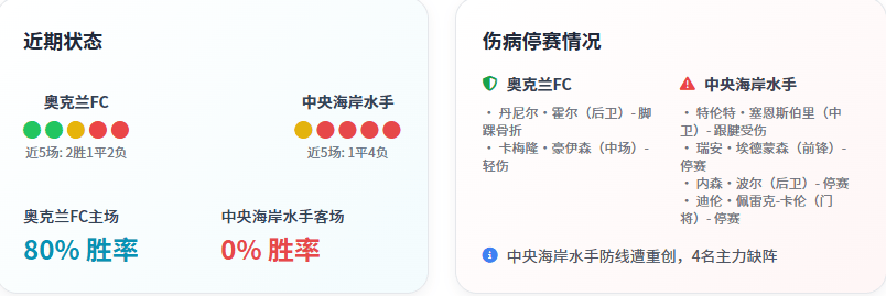 中央海岸水手则陷入持续低迷,近10场比赛仅赢2场、输6场,上轮主场1-2不敌悉尼FC,士气再度受挫,近5场更是1胜1平3负,攻防两端全面拉胯。伤病成为球队的致命短板,防线核心特伦特·塞恩斯伯里跟腱受伤长期缺阵,中场主力斯蒂尔也无法出战,加之前锋瑞安·埃德蒙森、后卫内森·波尔、门将迪伦·佩雷克-卡伦三人停赛,攻防体系近乎残缺,临时拼凑的防线协防默契全无,面对奥克兰的高压进攻大概率难以支撑全场。