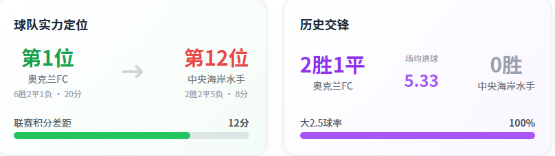 历史交锋上,奥克兰FC完全掌握主动权,近4次对决2胜2平保持不败,本赛季首回合客场2-1击败中央海岸,进一步巩固了心理压制力。值得一提的是,双方近两次澳超碰面均由奥克兰取胜,且近3次交手总进球数均控制在3球以内,既体现了奥克兰的掌控力,也反映出中央海岸面对克星时虽防守被动但不易崩盘的特质。不过本赛季中央海岸伤病加剧,过往的防守韧性恐难延续。