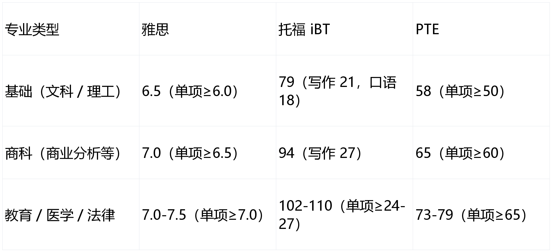 - 特殊专业:教育 / 医学 / 法律雅思 7.0-7.5(单项≥7.0);商科(商业分析等)雅思 7.0(单项≥6.5)。