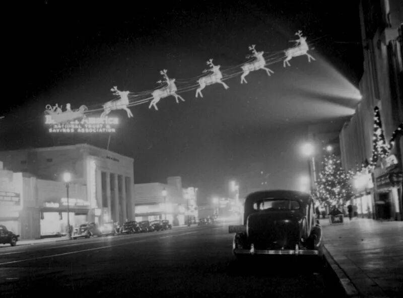 如果你有幸在威尔夏大道上开车,那就意味着你会从八只小驯鹿拉着的圣诞老人雪橇下方经过。在彩色胶卷没有发明之前,这个精灵般的雕塑在光线的照射下,产生了超现实的效果。