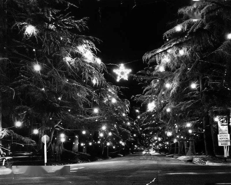 1961年,德罗莎大道的圣诞树巷如往常一样照亮了节日。圣诞树巷是一条位于加利福尼亚州,一公里长的雪松林公路。