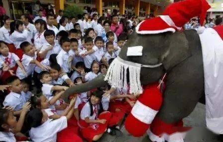泰国的大象戴上圣诞帽,给小朋友分发礼物