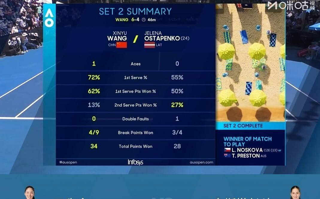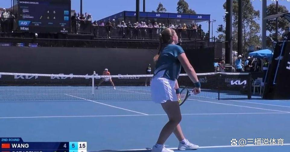 比赛变成了5-4,王欣瑜领先,但轮到了奥斯塔彭科发球。压力,再次来到了王欣瑜这边,她必须破掉这个发球局才能直接获胜,否则比赛将进入更加紧张的拉锯战。王欣瑜没有让悬念持续太久,她在对手的发球局里打得坚决而果断。随着奥斯塔彭科一记回球出界,王欣瑜在决胜盘第二次破发成功,以6-4锁定了整场比赛的胜利。