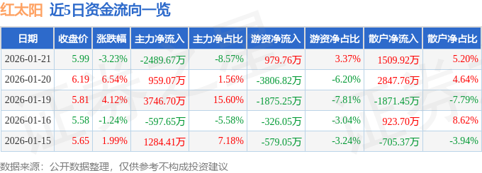 证券之星消息,截至2026年1月21日收盘,红太阳(000525)报收于5.99元,下跌3.23%,换手率4.35%,成交量48.37万手,成交额2.91亿元。
