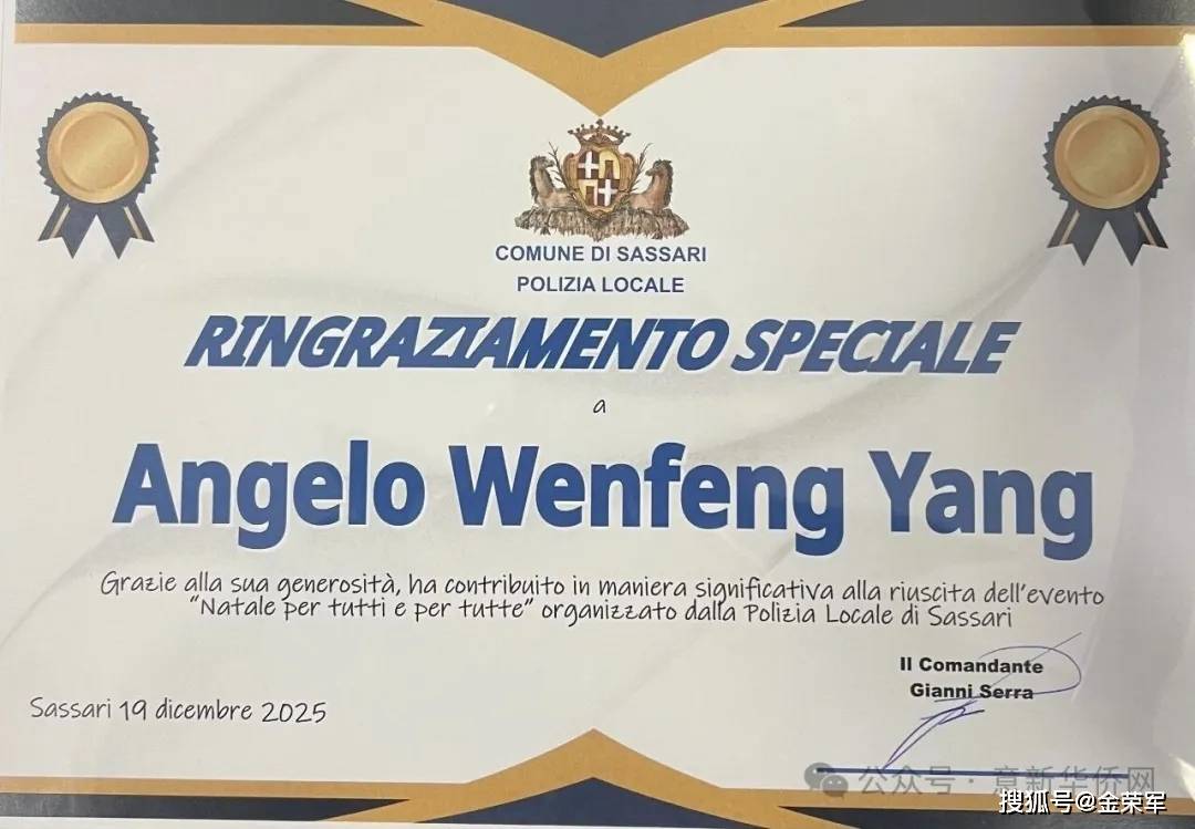 意大利新华时报金荣军报道:2025年12月19日,在圣诞节前夕,意大利撒丁岛华侨华人商会会长杨文锋向意大利撒丁岛撒撒里市警察局捐赠了圣诞节礼物,并通过他们送给当地的福利机构孩子们,在节日里送去侨胞的一份温暖,撒撒里市警察局局长GIANNI SERRA为感谢杨文锋会长的善举,亲自向他颁发的感谢荣誉证书。这也是杨文锋连续多年向该警察局捐赠圣诞节礼物的又一次善举。