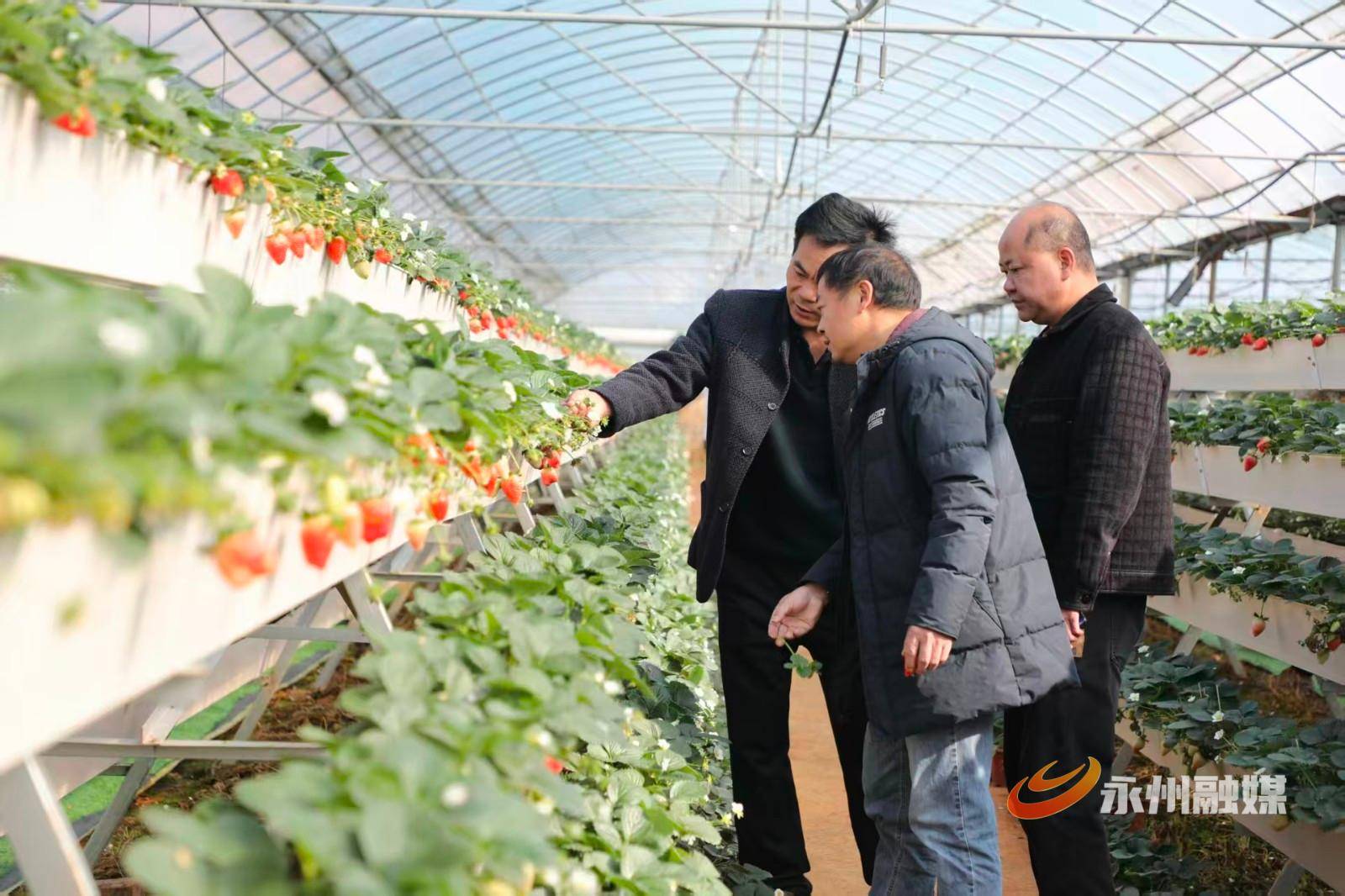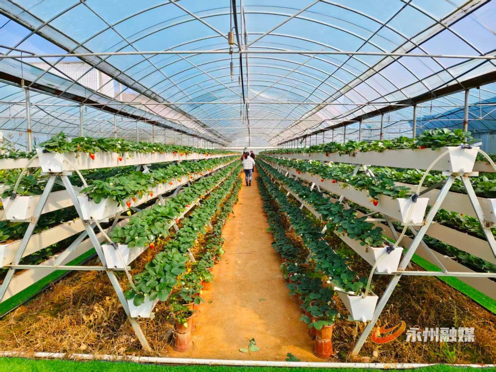 12月27日,走进蓝山县太平圩镇超拓农业种植有限公司连栋集中育秧大棚内,清甜的果香扑鼻而来,整齐排列的立体栽培架上,翠绿的藤蔓沿支架蓬勃生长,饱满的草莓悬空垂挂;游客们提着果篮穿梭其间,驻足挑选、采摘尝鲜;技术人员俯身修剪老叶、打理藤蔓。