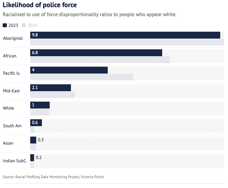 2024年期间,被维州警方认定为原住民的人,遭到搜查的可能性是白人的15倍,