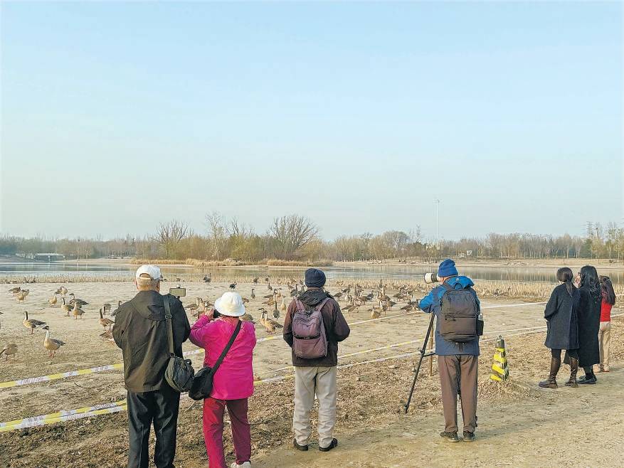 游客在岸边观赏鸿雁。 实习记者 刘玉洁摄
