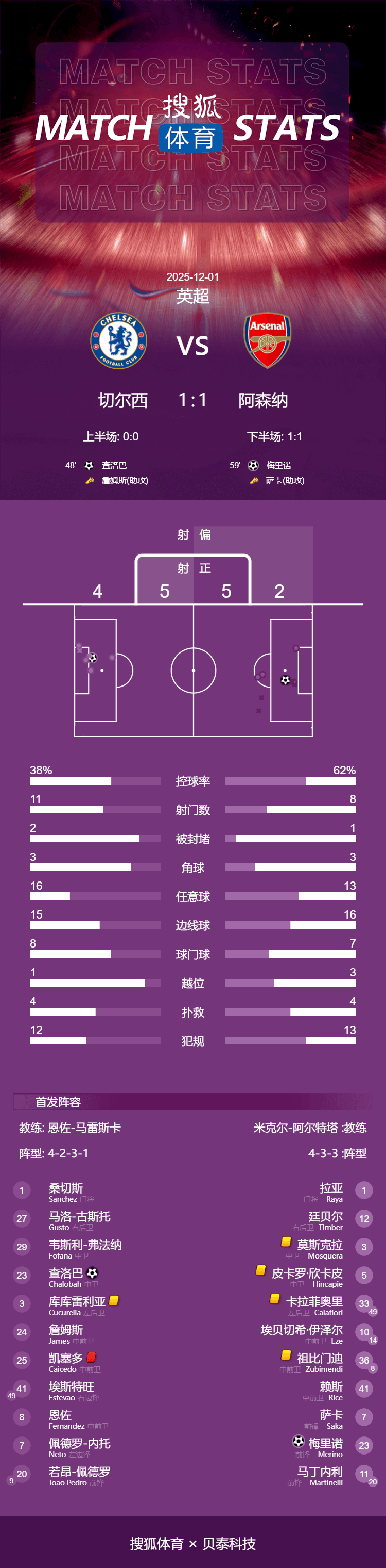 北京时间12月1日凌晨0:30,英超25/26赛季第13轮,切尔西主场迎战阿森纳。上半场,凯塞多染红离场,双方均未能打破僵局。下半场,查洛巴和梅里诺分别为两队建功,最终切尔西1-1战平阿森纳。