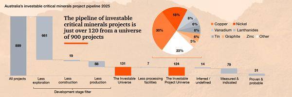 PwC《2025年澳大利亚矿业报告》在对全澳899个关键矿产项目进行审视后发现上述结论,并认为澳洲关键矿产领域可投资项目储备的深度以及这些项目的规模方面存在的疑问。