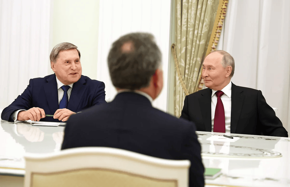 12月2日,普京、俄总统助理乌沙科夫与美特使威特科夫(背身)在克里姆林宫举行会谈