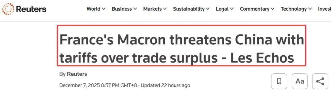 访问结束后仅两天,马克龙在12月7日发表于《回声报》的访谈中直言:“如果他们不作出反应,欧洲将在未来数月内被迫效法美国,采取强硬措施,例如对中国商品加征关税。”
