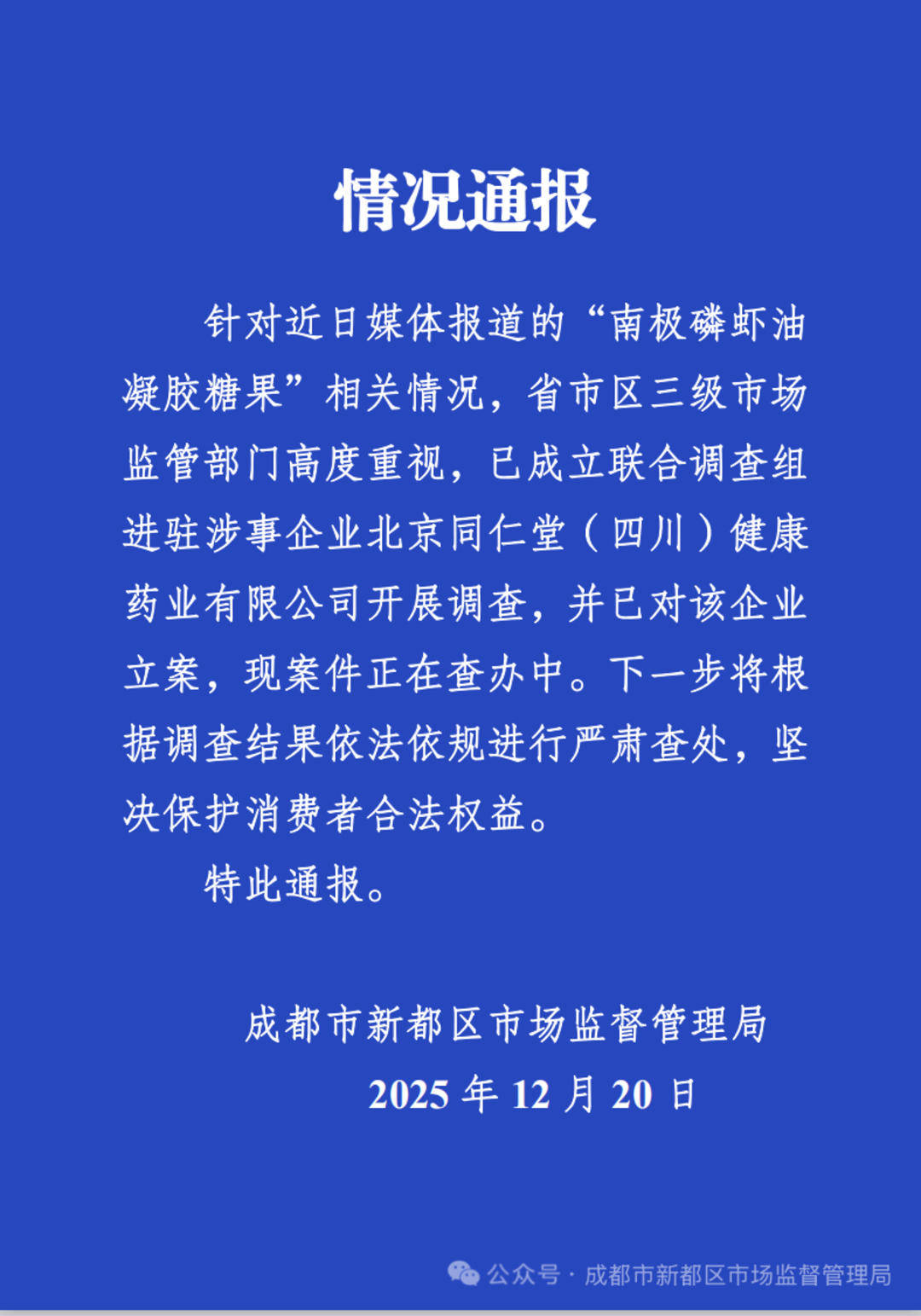 12月20日,这款产品经销商所在地的成都市新都区市场监管局发布情况通报称,省市区三级市场监管部门高度重视,已成立联合调查组进驻涉事企业北京同仁堂(四川)健康药业有限公司开展调查,并已对该企业立案,现案件正在查办中。下一步将根据调查结果依法依规进行严肃查处,坚决保护消费者合法权益。