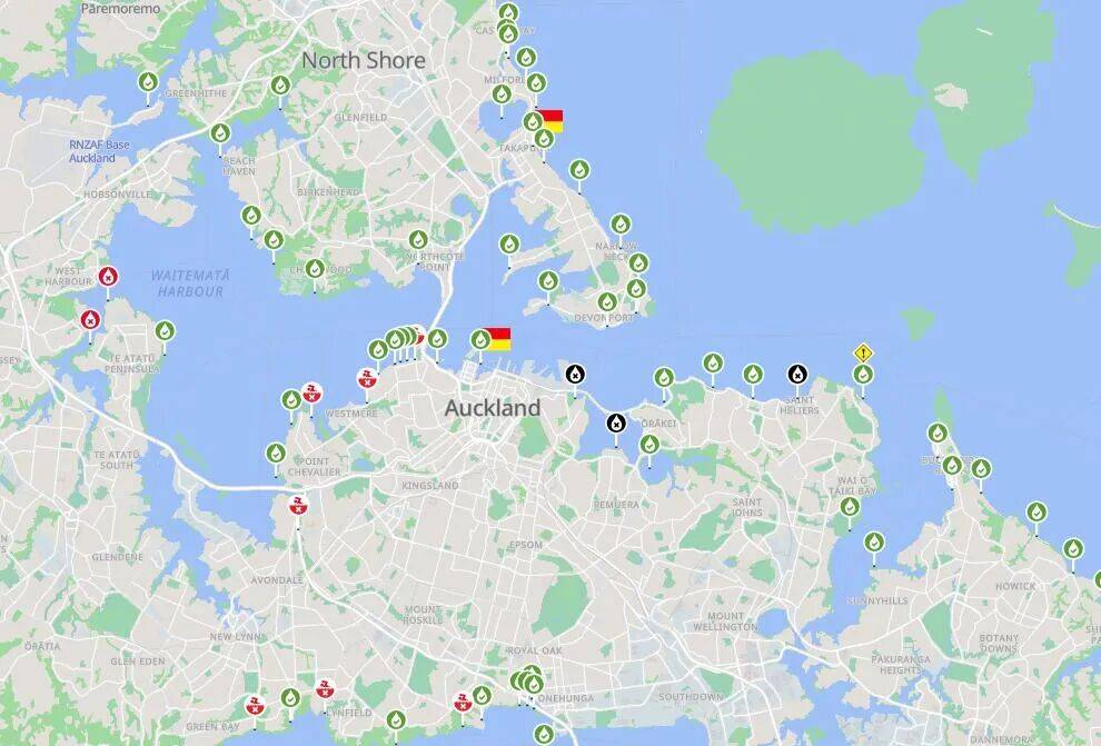 此外,有两个地点被列为黑色警告,即完全不宜游泳,分别是St Heliers和Judges Bay。