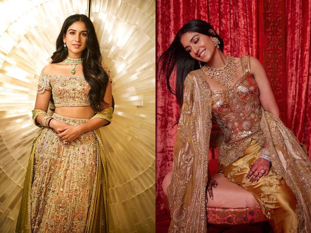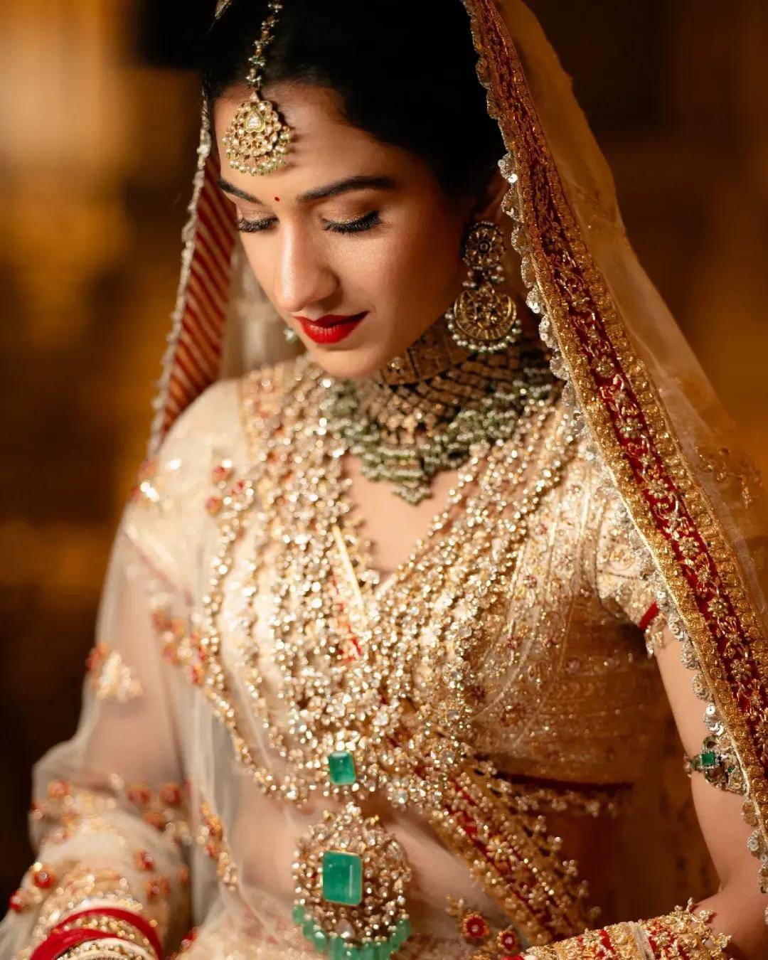 她的婚礼珠宝就几乎不重样,一身戴出了铠甲的感觉。其中这条五排钻石项链是新娘的“传家宝”,是她的爸爸当年送给妈妈的。由孟买珠宝商Nisha Mehta设计,采用未经切割的钻石和赞比亚祖母绿打造,中间有一颗巨大祖母绿吊坠,她还搭配了妈妈其他的古董珠宝,风格相当贵气。