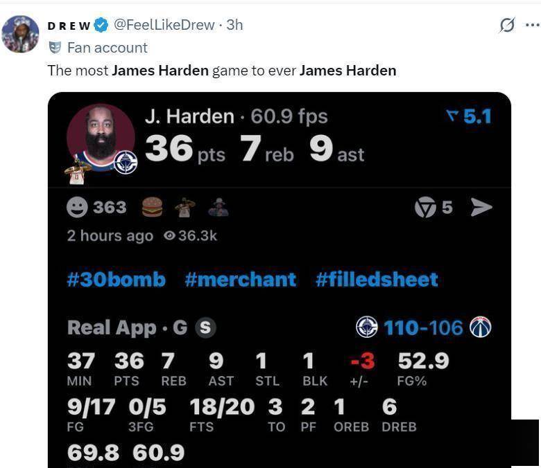 对于一名36岁的老将来说,哈登本赛季的表现令人惊叹。他场均出战时间超过37分钟,在关键时刻依然能保持高效得分。这种耐久性和稳定性,正是全明星球员应有的特质。