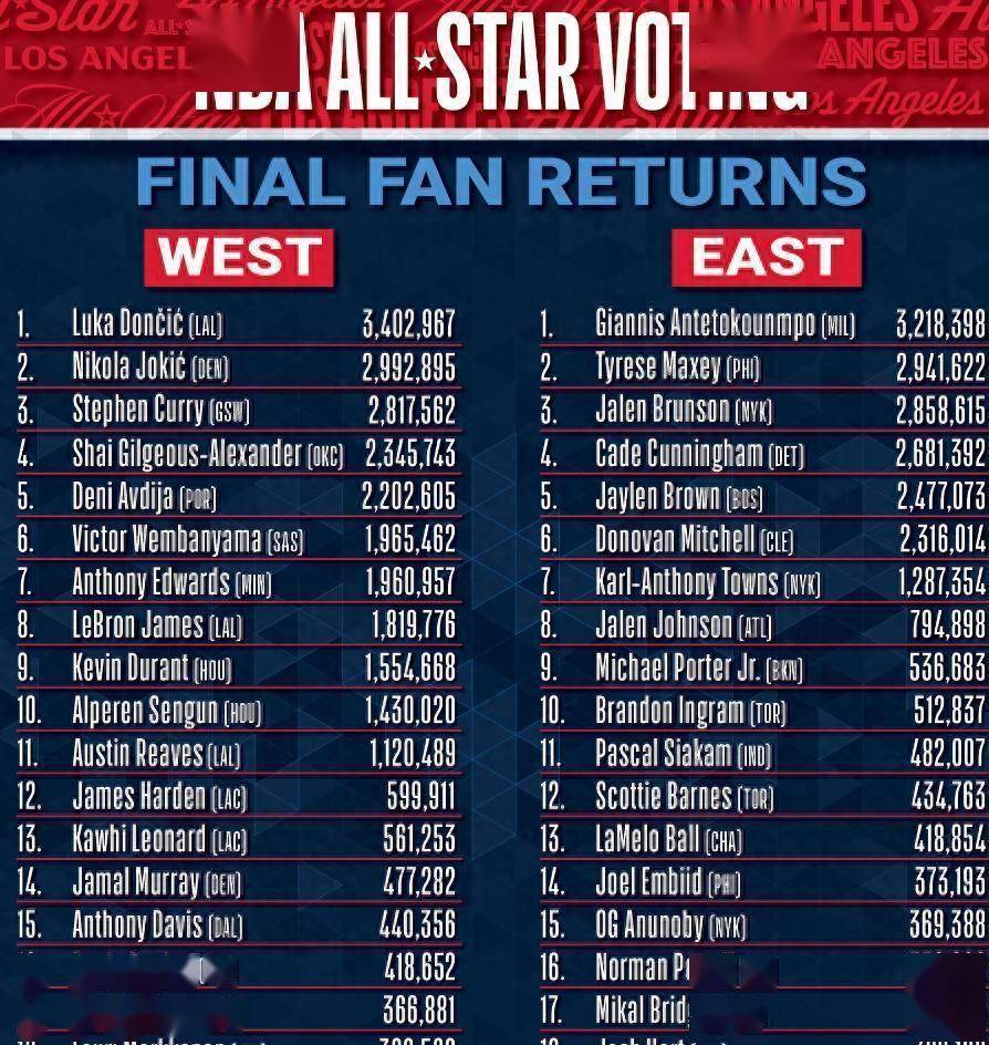与此同时,NBA官方公布了全明星球迷投票结果。莱昂纳德位列第13,哈登排在第12名。综合考虑球员投票后,莱昂纳德最终排名第十,入选全明星替补阵容希望较大;而哈登则无缘前十,需要西部教练的认可才可能进入全明星。