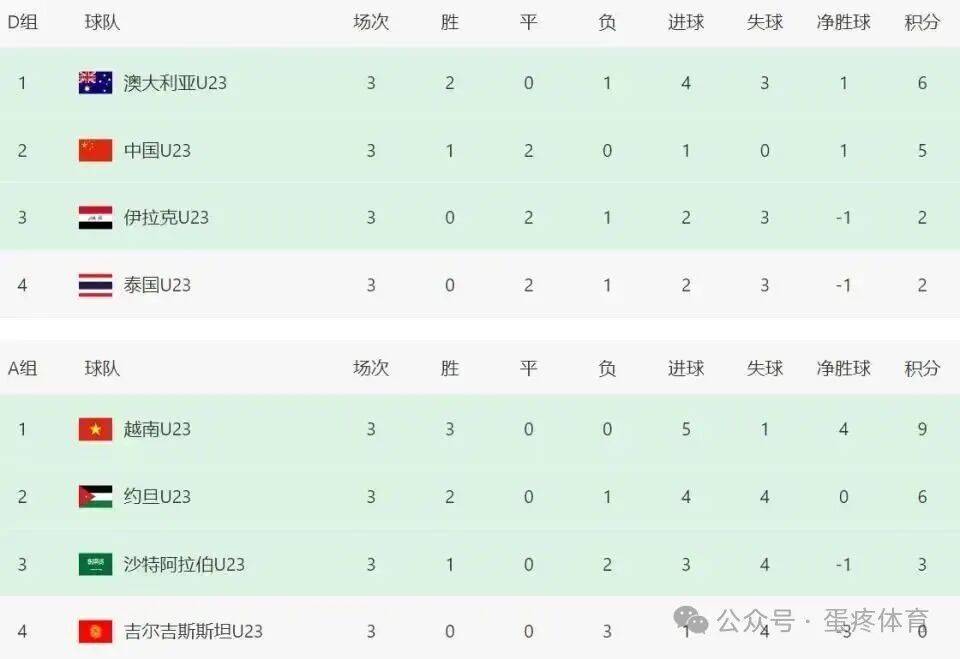 对阵泰国的比赛,国足只要保持不败就能顺利出线,最终国足也是凭借坚强的意志,有惊无险的将比分定格在0:0!整个小组赛,国足1胜2平3场0失球,以小组第二的身份强势晋级八强,创造了U23男足历史。