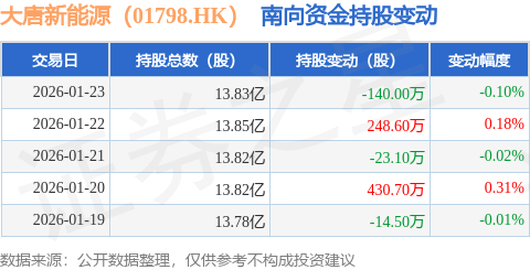 证券之星消息,1月23日南向资金减持140.0万股大唐新能源(01798.HK)。近5个交易日中,获南向资金增持的有2天,累计净增持501.7万股。近20个交易日中,获南向资金减持的有13天,累计净减持4507.63万股。截至目前,南向资金持有大唐新能源(01798.HK)13.83亿股,占公司已发行普通股的55.3%。