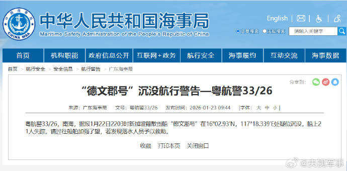 据中国海事局网站消息,广东海事局发布航行警告,1月22日22时03分,新加坡籍散货船“德文郡号”在16°02.93′N,117°18.339′E处疑似沉没,船上21人失踪,请过往船舶加强瞭望,若发现落水人员予以救助。