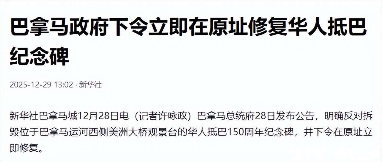天底下竟然还有这种事?没有任何通知和理由,就直接拆除涉及中国的建筑!中国方面对此表示极大的愤怒,巴拿马政府在不到24小时内立即道歉,并下令恢复原状。 12月29日,中国驻巴拿马大使馆发布消息,针对巴拿马阿赖汉市政府在没有任何事先通知的情况下,强行拆除象征中巴友谊的中巴公园以及华人抵达巴拿马150周年纪念碑的事件,发表了严正声明。事情的经过是这样的:12月27日深夜,阿赖汉市政府在没有提前告知、也没有与当地华人社团沟通的情况下,擅自拆除了位于美洲大桥观景台上的中巴公园和华人抵巴150周年纪念碑。这两个建筑自2004年由华人社团资助并得到中国政府支持建设。公园和纪念碑的建立得到了巴拿马政府的认可,巴政府在2004年宣布每年的3月30日为“华人日”,以纪念华人社区为巴拿马发展做出的贡献。