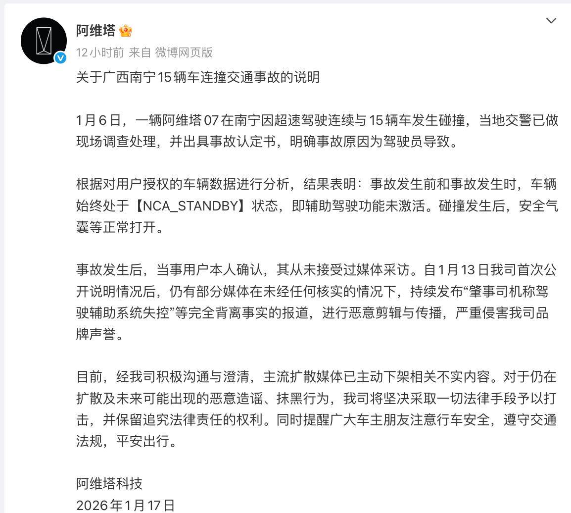 阿维塔称,事故发生后,当事用户本人确认,其从未接受过媒体采访。自1月13日我司首次公开说明情况后,仍有部分媒体在未经任何核实的情况下,持续发布“肇事司机称驾驶辅助系统失控”等完全背离事实的报道,进行恶意剪辑与传播,严重侵害我司品牌声誉。