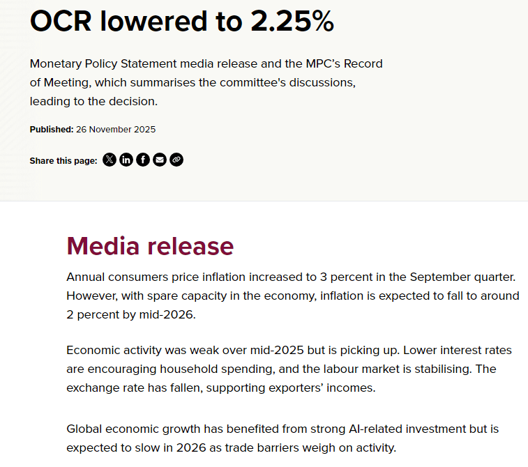 新西兰央行11月26日宣布,将官方现金利率下调25个基点至2.25%。