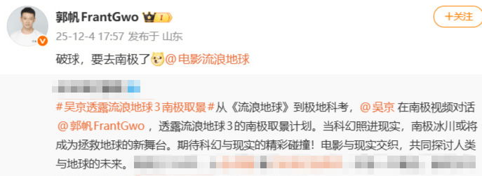 搜狐娱乐讯 近日,吴京在纪录片中透露《流浪地球3》将到南极取景,他现场给导演郭帆打视频电话展现南极之美,郭导按捺不住:“必须得去拍啊,我的天呐,太美了!”4日,郭帆还转发官宣道:“破球,要去南极了!”