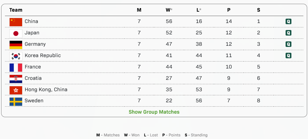 第二阶段比赛结束后,中国队、日本队、德国队和韩国队位列积分榜前4,进入第三阶段淘汰赛。半决赛,中国队将对阵韩国队,日本队将对阵德国队。