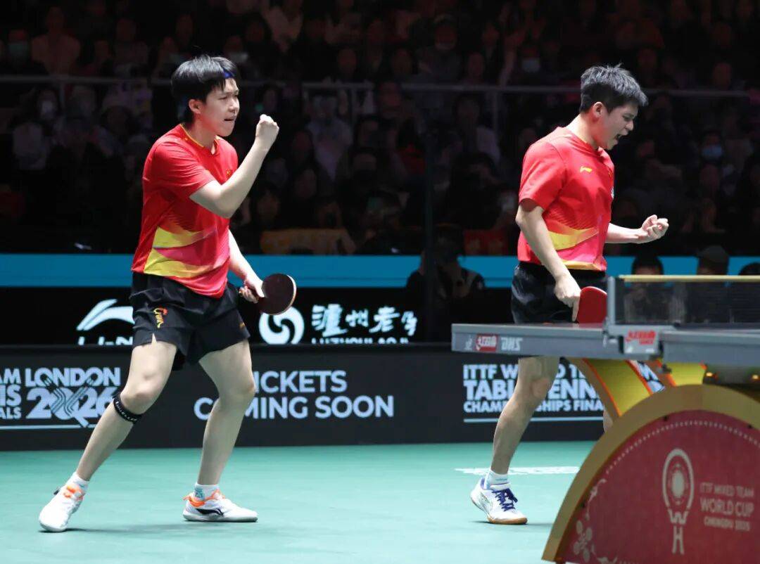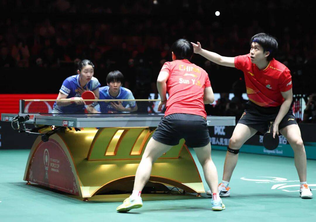 王楚钦/林诗栋在第四盘对阵世乒赛冠军组合篠塚大登/户上隼辅,日本组合虽然在单板质量上并不上风,但利用灵活跑位和落点连下两局。随后王楚钦/林诗栋奋力拿下第3局,中国队7比5率先拿到赛点。