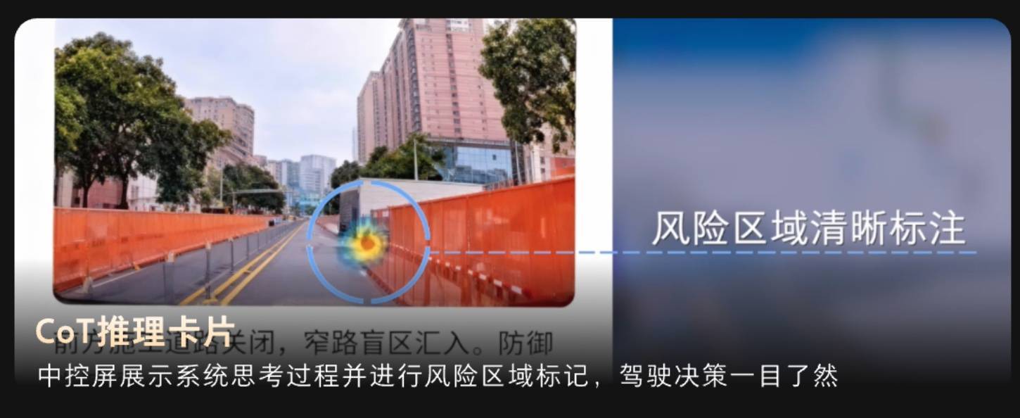 更值得关注的是,为缓解端到端模型常见的「黑盒」信任难题(即用户无法理解 AI 为何突然刹车或变道),蓝山创新性地引入了 CoT(思维链)可视化功能。该功能将系统的感知、推理与决策过程实时呈现在中控屏上,通过透明化操作逻辑,有效降低用户对智能驾驶的焦虑感。