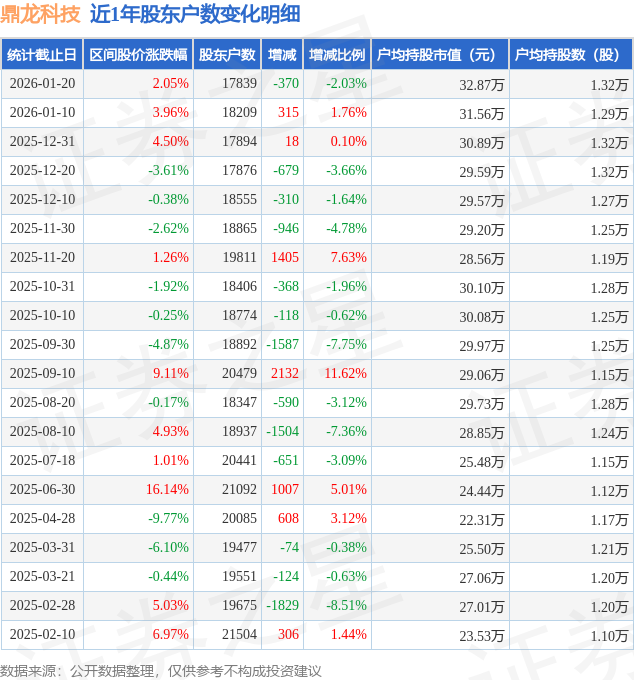 证券之星消息,近日鼎龙科技披露,截至2026年1月20日公司股东户数为1.78万户,较1月10日减少370.0户,减幅为2.03%。户均持股数量由上期的1.29万股增加至1.32万股,户均持股市值为32.87万元。