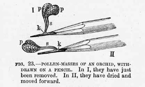 在《论不列颠和外国兰花借助昆虫受精的各种发明,兼论互交的良好效果》一书中,达尔文详细说明了兰花的精巧机制如何促进其进行异花受精。在他常去的兰坡上,长着英国常见的雄兰(Orchis mascula)。雄兰花朵的底部是一枚扩大的花瓣,术语叫“唇瓣”。达尔文指出,它是昆虫的“良好落脚点”。为了够到花蜜,昆虫把头扎进花里,蹭过合蕊柱顶端的花粉块。这会触动黏囊,使之破裂,然后让有黏性的花粉块牢牢粘在昆虫头部。昆虫带着花粉块出来之后,如果就这样带着花粉块爬进下一朵花,那只会把前一朵花的雄性花粉块蹭落。但是达尔文注意到一个现象: