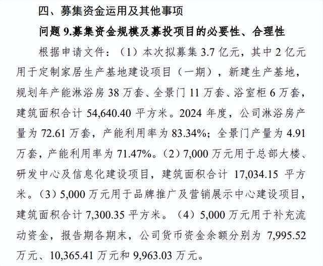 问询函指出,本次拟募3.7亿元中有2亿元用于“定制家居生产基地建设项目(一期)”,规划新建生产基地,达产后将形成年产淋浴房38万套、全景门11万套、浴室柜6万套的产能。