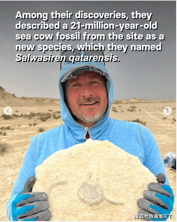 ▲上图:研究人员描述了一具来自该遗址的2100万年前的海牛化石,并将其命名为一个新物种:萨伊华海牛卡塔尔(Salwasiren qatarensis)。摄影:Ferhan Sakal, Qatar Museums