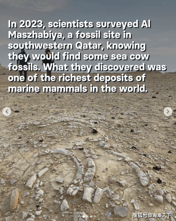 2023年,科学家们对位于卡塔尔西南部的化石遗址AlMaszhabiya进行了勘察。他们原以为会发现一些海牛化石,但最终的发现却是世界上最丰富的海洋哺乳动物沉积层之一。摄影:Ferhan Sakal, Qatar Museums