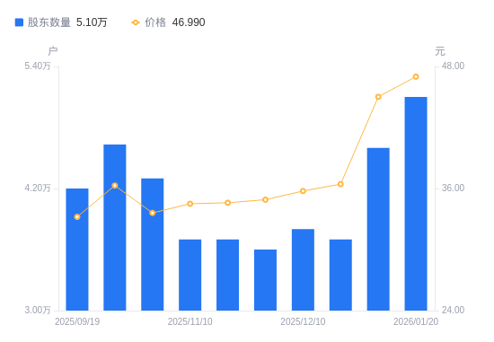 日期A股户数(户)流通A股户均持股数(股)户均持股市值(万元)2026-01-205100014452.8967.912026-01-094600016023.8672.122025-12-193700019914.6072.552025-12-103800019385.7569.302025-11-283600020462.7471.412025-11-203700019904.3968.872025-11-103700019904.3968.672025-10-204300017123.6557.542025-09-304632215895.2357.682025-09-194200017495.4758.10