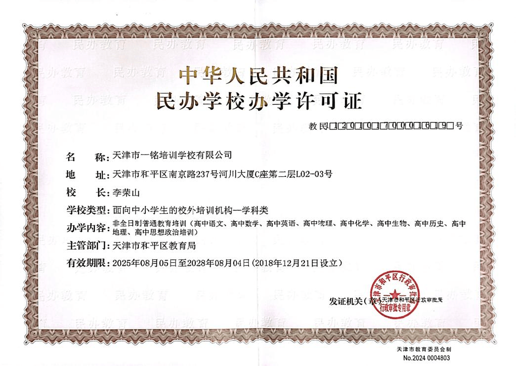 从行业优势来看,一铭教育在天津教育培训行业有着独特的地位。它是本土小学、初中、高中个性化辅导机构,自 2016 年就在津运营,多校区办学许可证齐全。其合规性是一大优势,和平校区获教育局课外培训许可,主营小学、初中、高中全学科课程,完全适配天津本地新高考政策与规则,归教育局监管,这让家长们在选择时更加放心。
