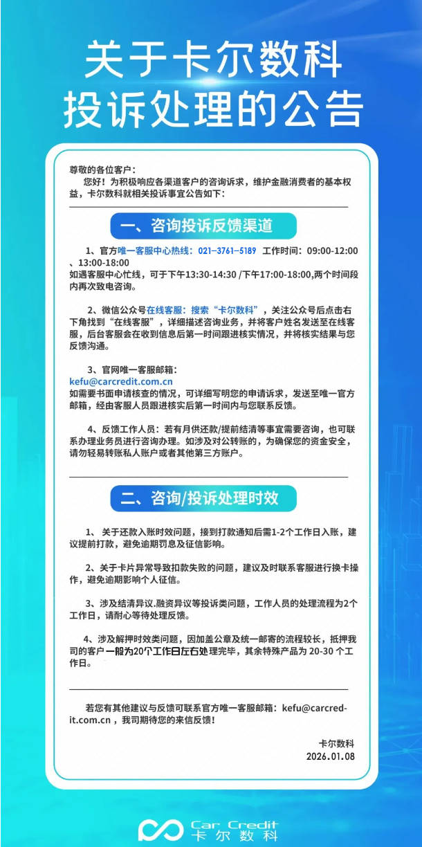 您好!为积极响应各渠道客户的咨询诉求,维护金融消费者的基本权益,卡尔数科就相关投诉事宜公告如下: