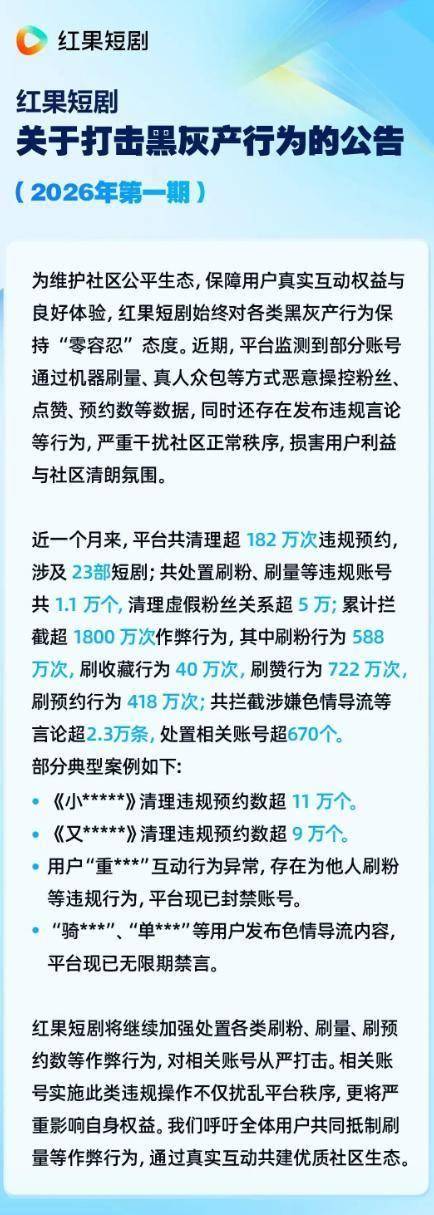 近一个月内,平台清理超182 万次违规预约,涉及 23部短剧;处置刷粉、刷量等违规账号共 1.1 万个;清理虚假粉丝关系超 5 万; 累计挡截超 1800 万次作弊行为,其中刷粉行为 588万次,刷收藏行为 40 万次,刷赞行为 722 万次刷预约行为 418 万次; 共拦截涉嫌色情导流等言论超2.3万条,处置相关账号超670个部分典型案例如下: