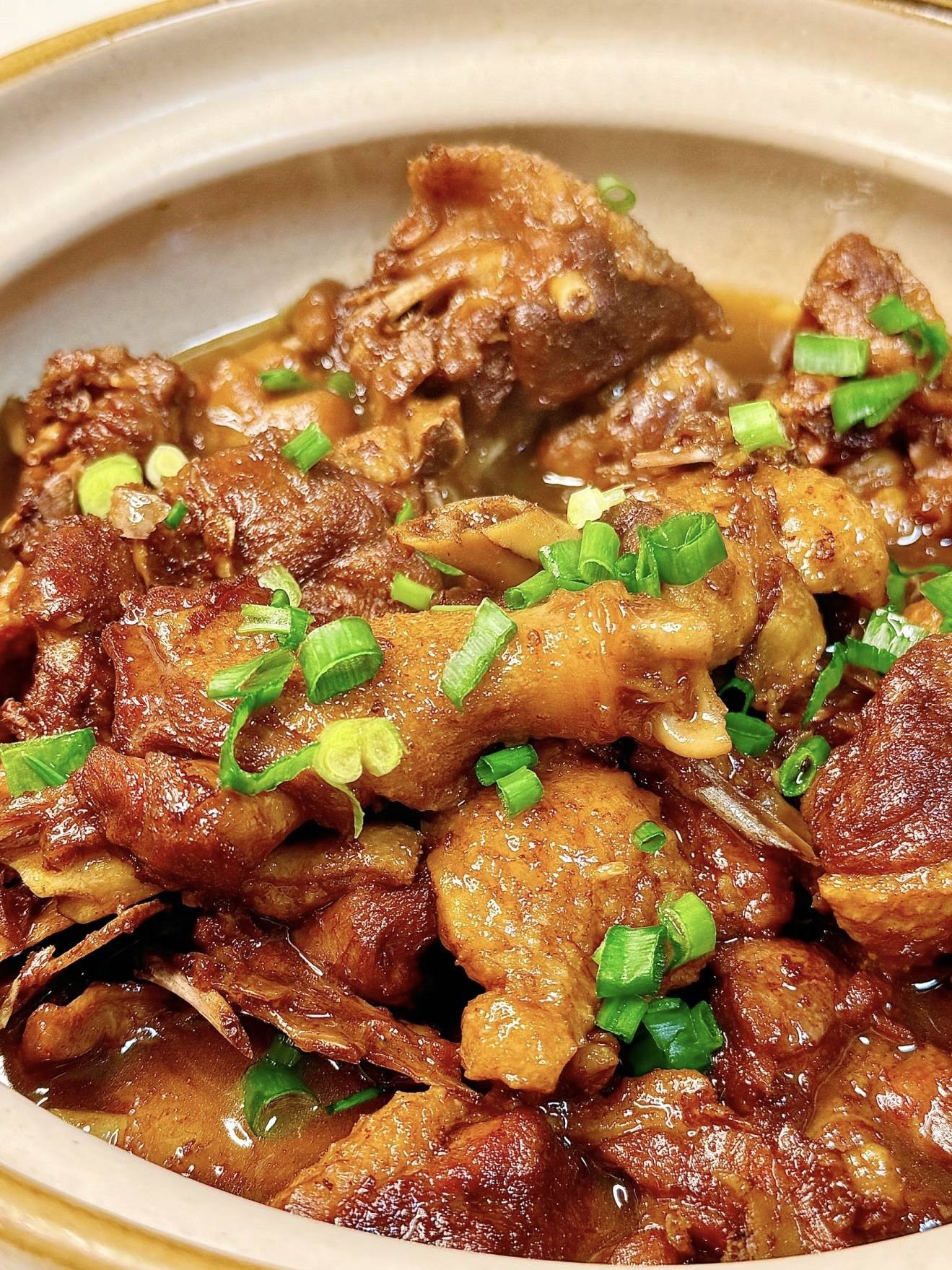 酱料只认“铁三角”:生抽两勺提鲜、老抽半勺上色、豆瓣酱一勺增味,再补少许盐,继续翻炒到酱汁均匀裹住鸭块。加开水!一定要开水,没过鸭肉一个指节,大火煮沸后转最小火,盖盖子炖30分钟。别急着走开,趁这空档剥几粒鹌鹑蛋、切点土豆块,时间到一起下锅,让鸭汤“顺路”把配菜的鲜味也带出来。最后十分钟转中火收汁,汤汁从稀薄→浓稠→挂勺,鸭肉表面出现“亮漆”就算成功。撒把青蒜苗,绿点一点,拍照直接赢点赞。揭盖瞬间,酱香混着八角、蒜香像火箭冲上天,鸭块油红发亮,筷子一夹就脱骨,咬一口肉汁“噗”地飙出,咸中带微甜,后味有豆瓣酱的醇厚。鹌鹑蛋被汤汁泡成“虎皮色”,土豆绵软吸饱鸭油,比肉还香。汤汁千万别浪费,浇米饭能连吃三碗,锅底刮得比脸还干净。剩的鸭子第二天回锅加热,味道更深,加一把挂面,秒变“鸭皇面”,室友闻到味立刻问你是不是偷偷开店。