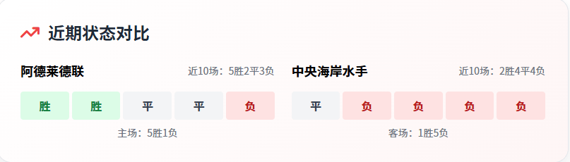 近期状态:阿德莱德势头回升,水手深陷连败泥潭