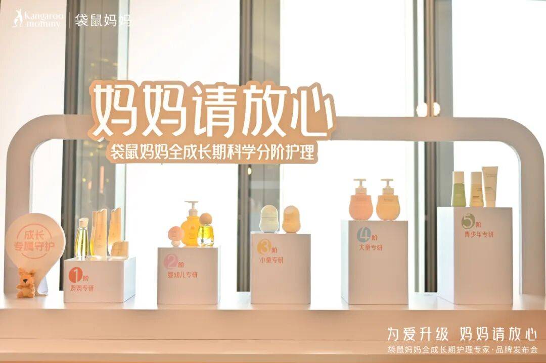 基于这一理念,袋鼠妈妈品牌突破性提出覆盖妈妈、婴幼儿、小童、大童、青少年五大阶段的“五阶护理”概念。