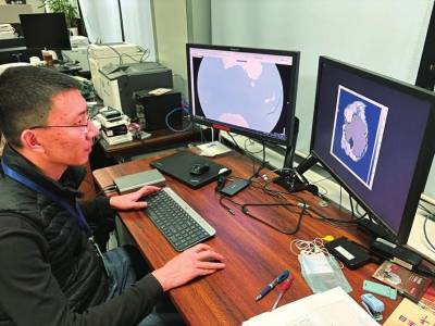 船时11月29日深夜,随船卫星保障人员、国家卫星海洋应用中心工程师纪元在电脑前接收中国“1米C-SAR卫星01”与“02星”数据,第一时间处理转化,并最终形成高分辨率卫星数据图片。