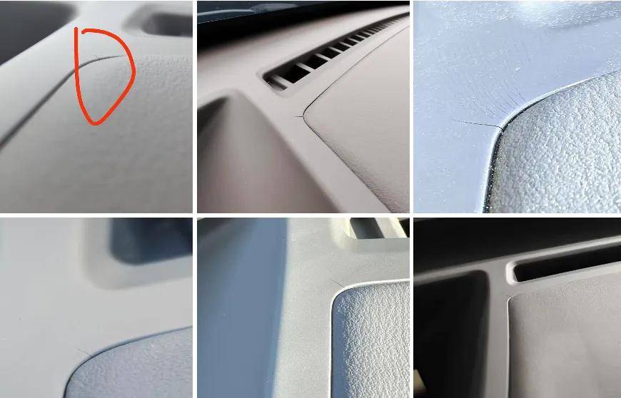 最早是北京一位车主,早上开车上班,阳光一照,突然瞅见仪表台HUD旁边的塑料框上有道细细的裂纹,一开始还以为是自己不小心磕到了。