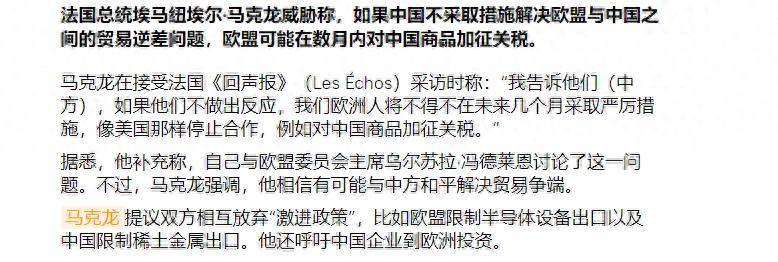 在回到巴黎后,马克龙显然没有展现出外交时的温和态度,反而采取了更加强硬的立场,显露出不愿展现诚意的态度,反而试图通过威胁加征关税来迫使中国让步。他明确表示,如果中国没有给予令法国满意的回应,欧盟将在未来几个月效仿美国的做法,采取强硬措施,比如对中国商品加税。将效仿美国挂在嘴边,显然是为了向中国施加更大压力。