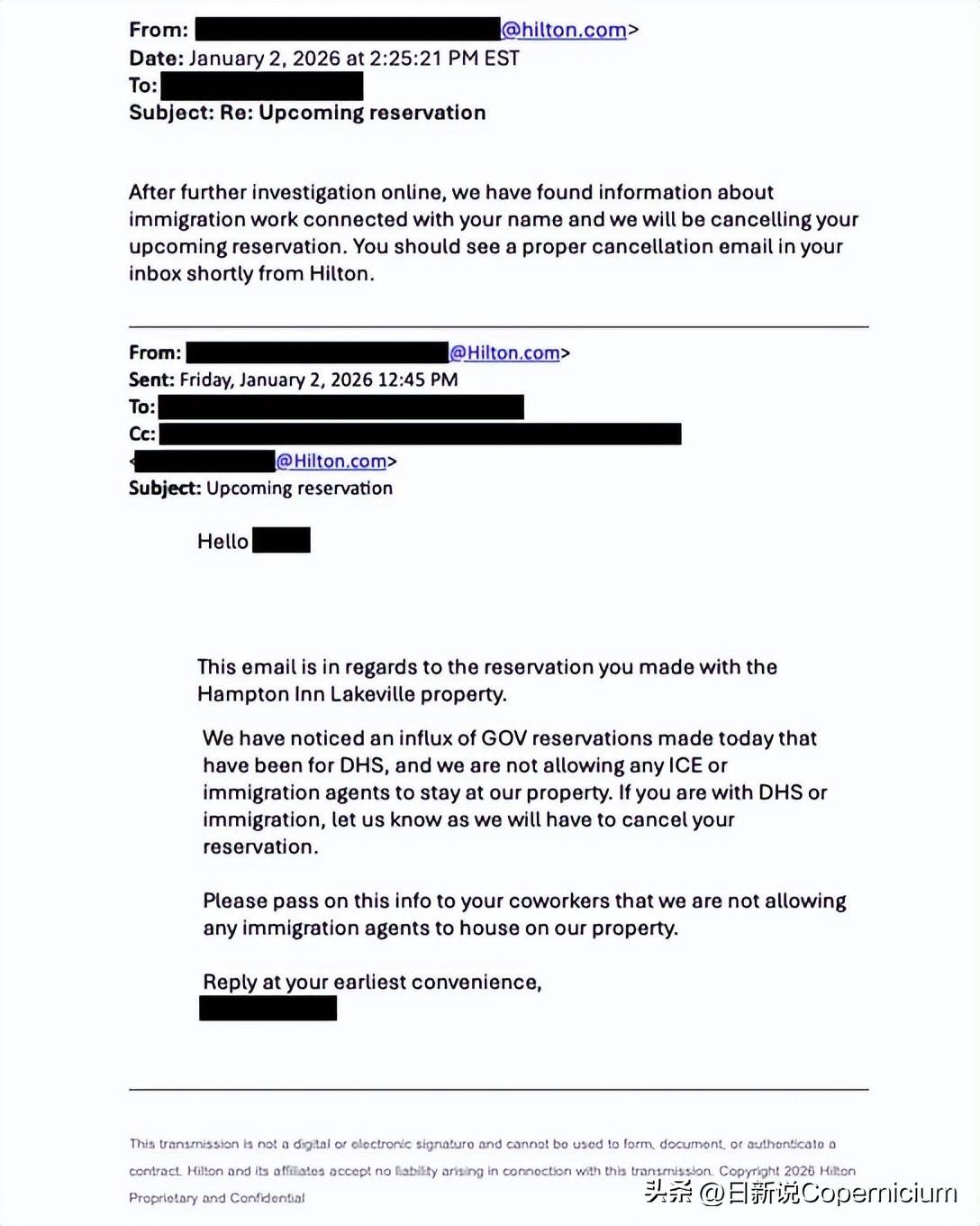 美国移民及海关执法局(ICE)透露,收到了来自希尔顿酒店的电子邮件,邮件明确表示不允许特工入住,并且会取消他们的预订。在社交平台X上,移民局公开质问道:“希尔顿酒店,你们为什么取消了我们联邦执法人员的预订?”这封邮件中写道:“我们注意到今天有很多来自国土安全部的政府预订,我们不允许ICE或移民局特工入住。如果您属于国土安全部或移民局,请提前告知我们,因为我们将不得不取消您的预订。”同时,邮件进一步要求酒店员工转告同事,不允许任何移民局特工入住。
