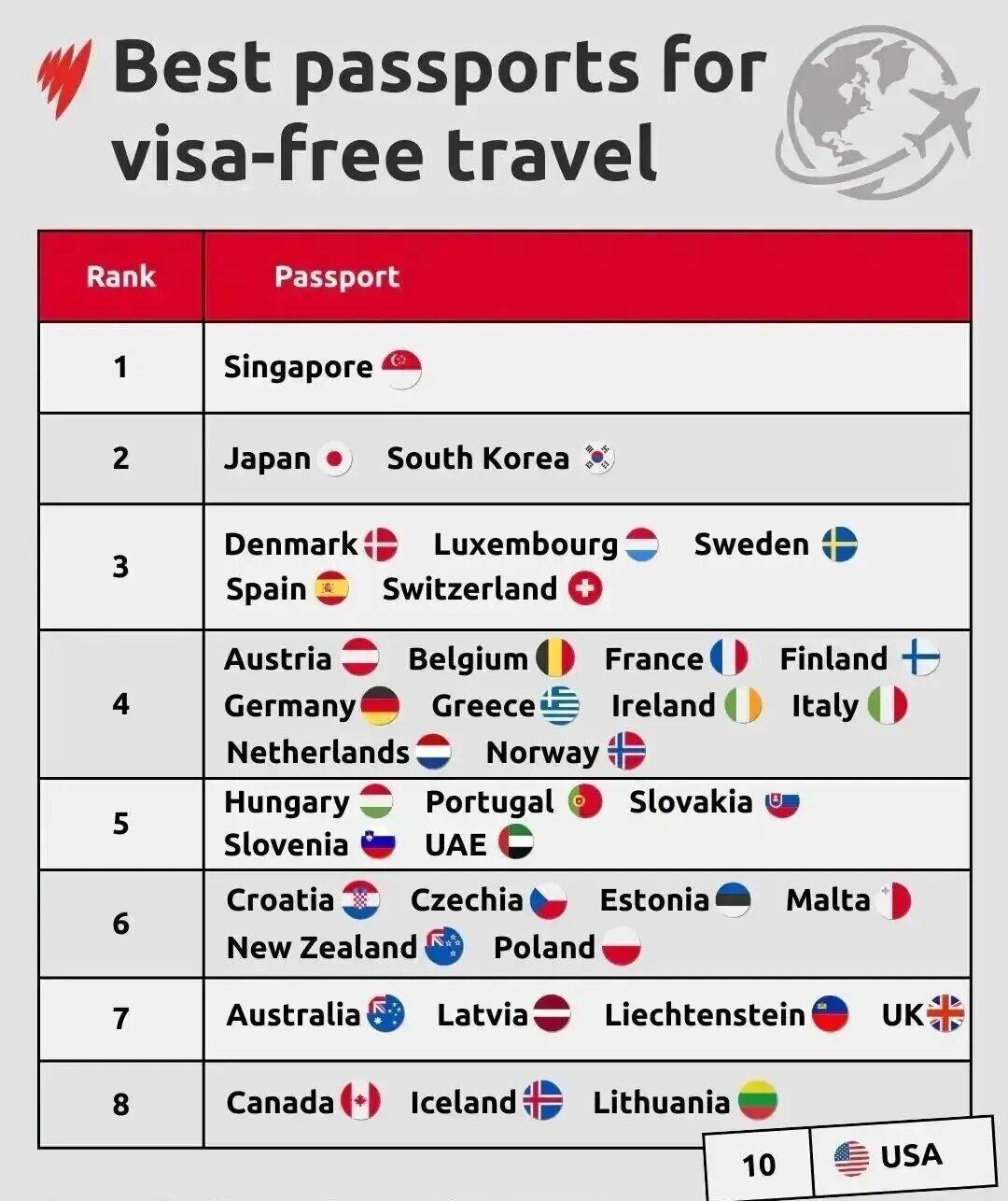澳洲护照含金量依然稳健,凭借182个免签目的地的优势位列全球第七。